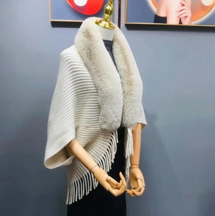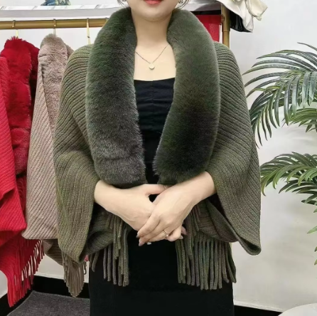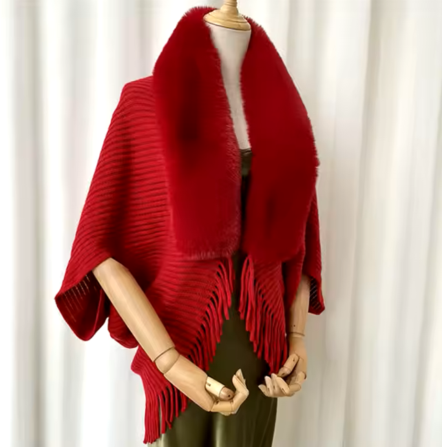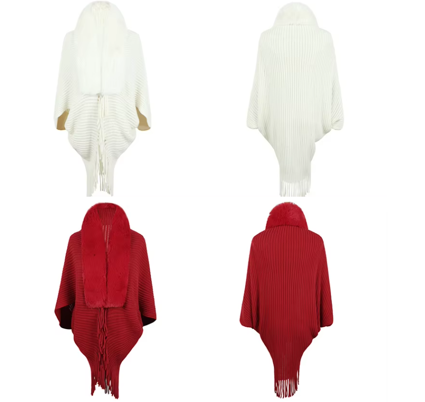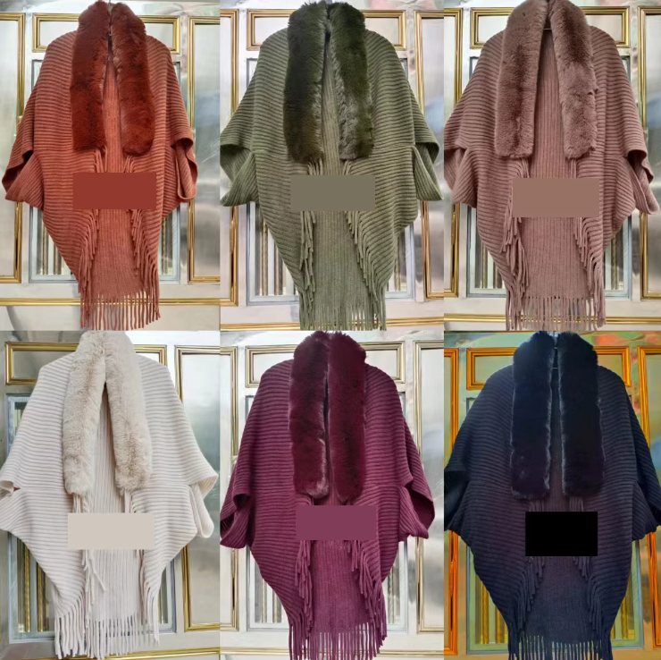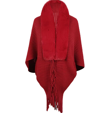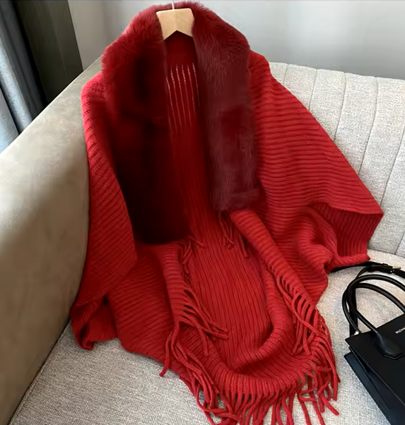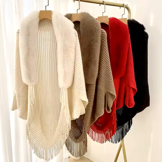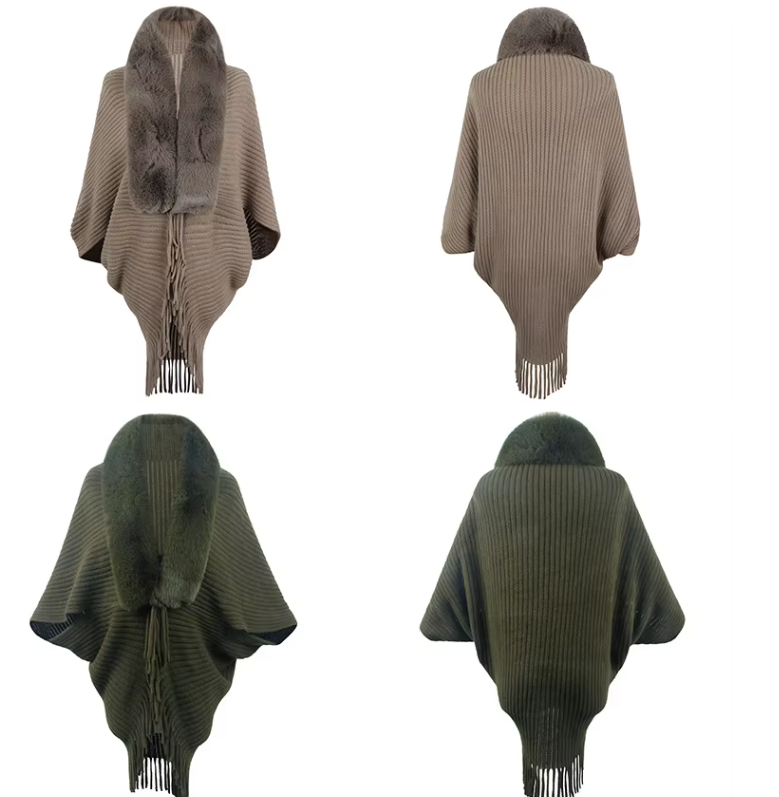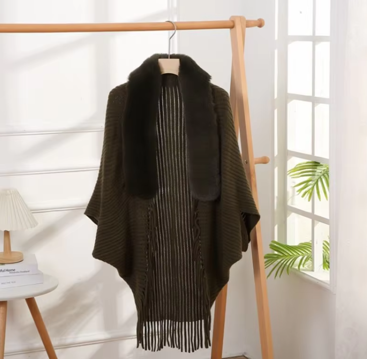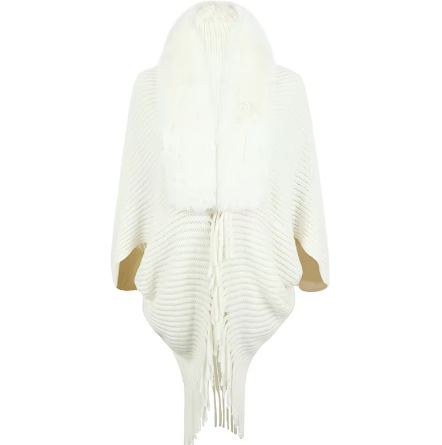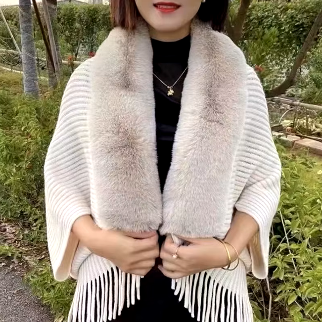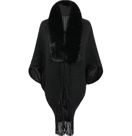 Trendy Faux Fur Collar Knitted Shawl, Warm Fashion Elegant Batwing Long Cloak With Tassel Cardigan For Women