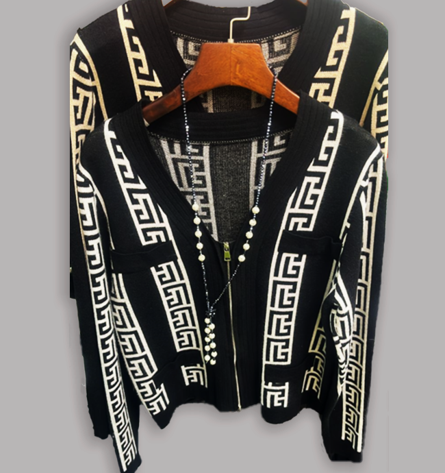 New Design Zip Decorated Long-Sleeved V-Neck Knitted Jacket, Elegant Geometric Design Casual Knit Top For Women
