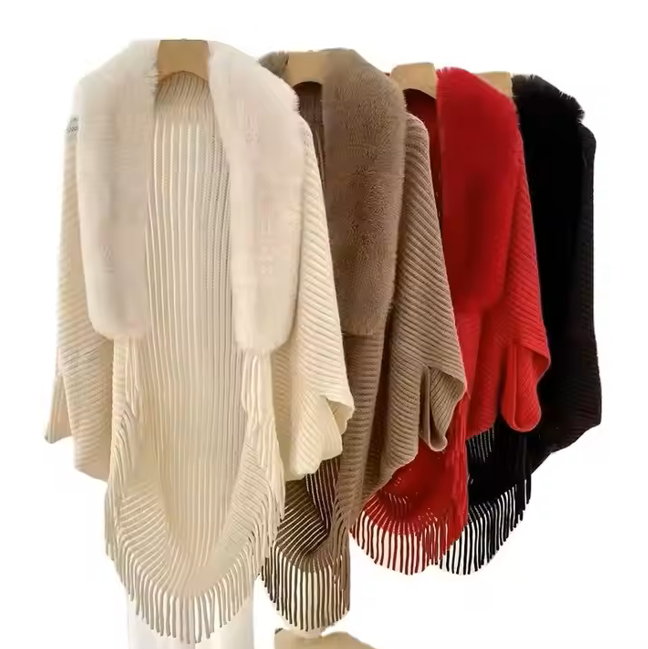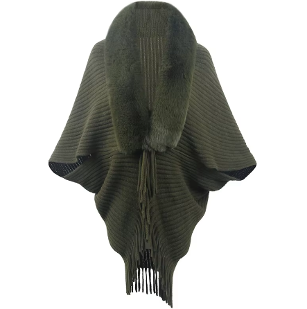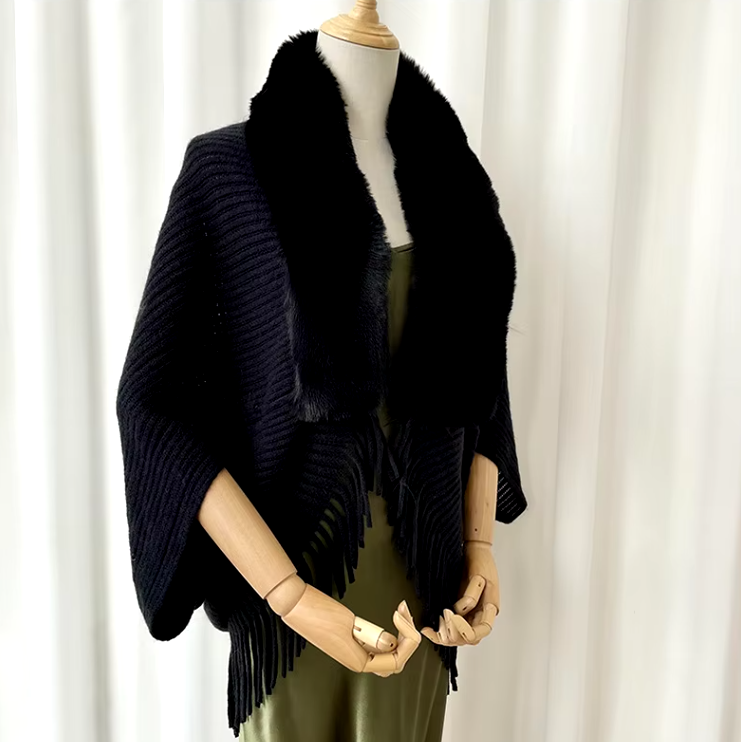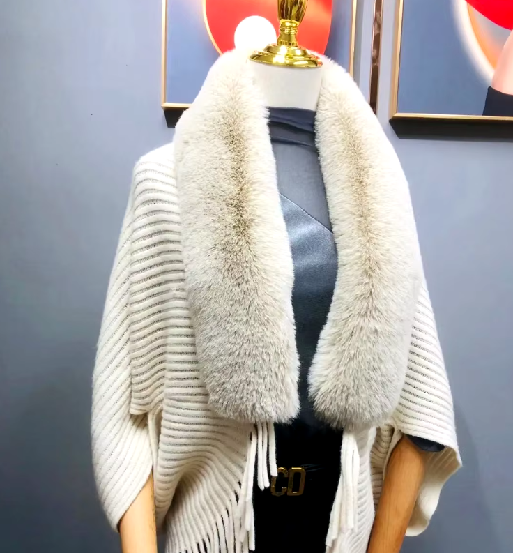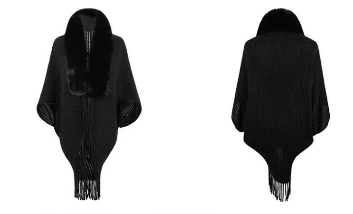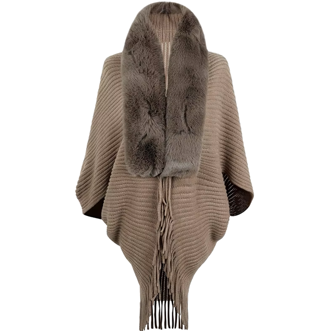 Trendy Faux Fur Collar Knitted Shawl, Warm Fashion Elegant Batwing Long Cloak With Tassel Cardigan For Women