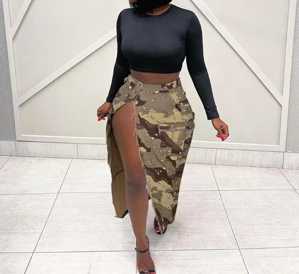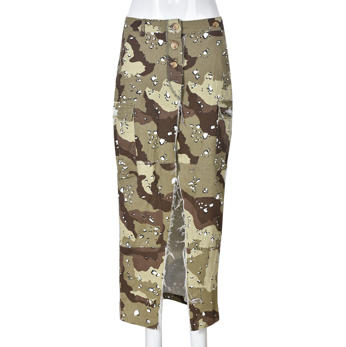Women's Camouflage Midi Skirt With Side Slit, High-Waisted Design Skirt with Large Pockets and Side Split, for Spring/Fall